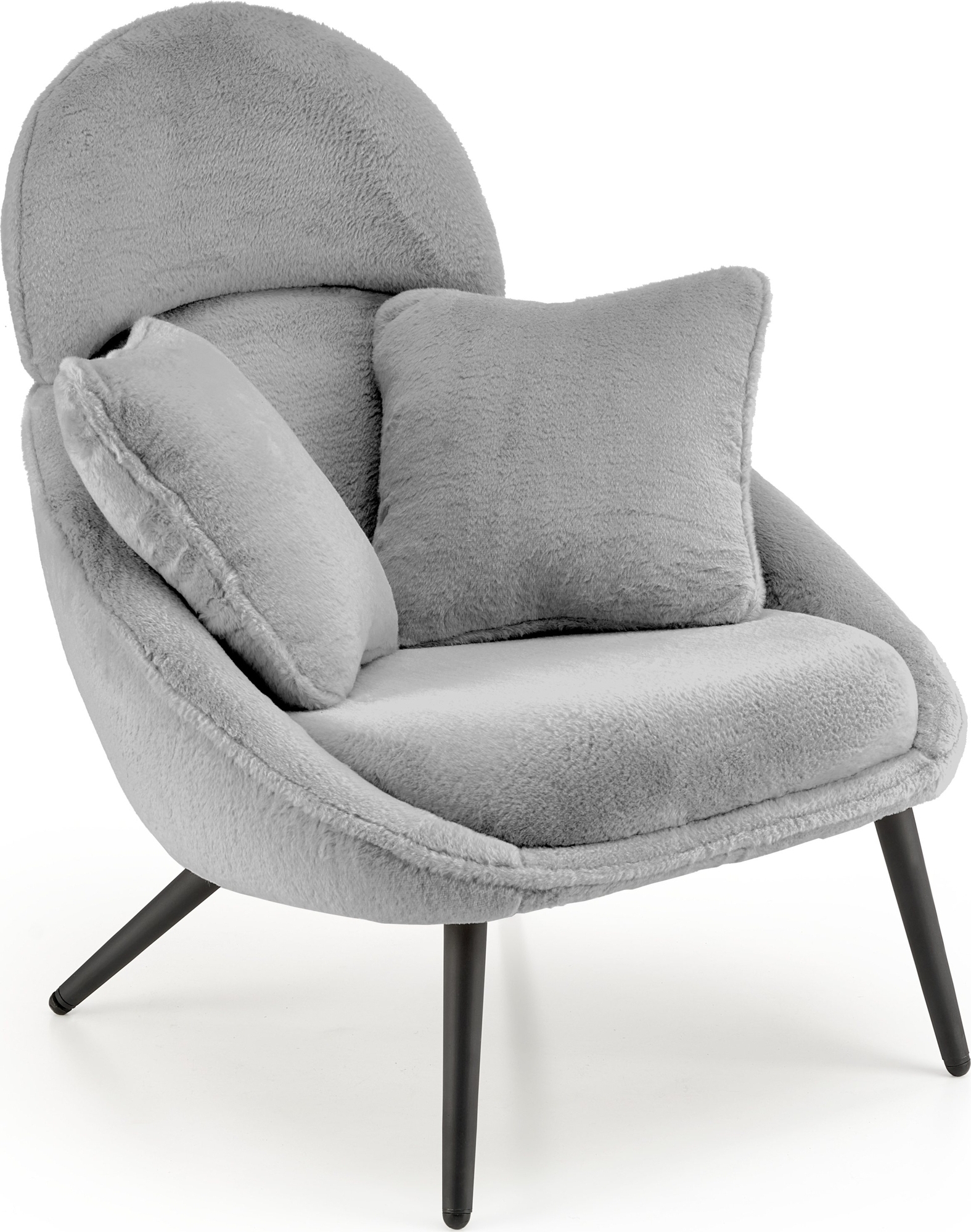 Fåtölj med underrede av pulverlackerad stål och klädsel av tyg.
