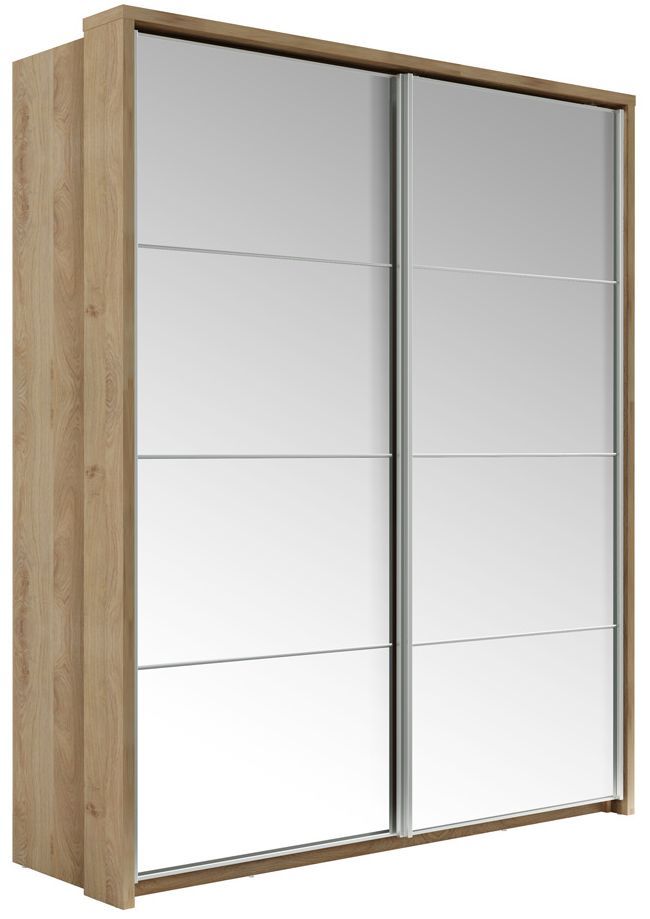 En snygg och mycket rymlig garderob med en modern design. Tillverkad i Chipboard och med många förvaringsmöjligheter. Bakom de två skjutdörrarna med spegelglas, finner du massa med utrymme, klädstång och hyllplan. Handtag av plast med blank finish. Levereras omonterad.