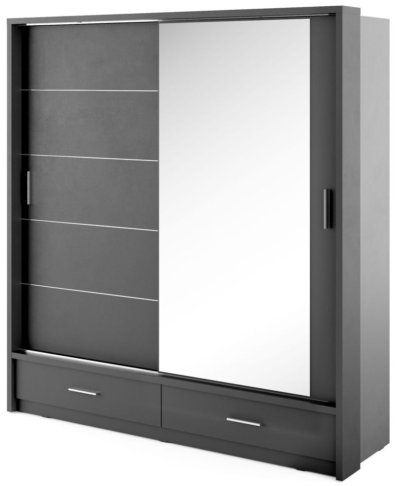 En snygg och mycket rymlig garderob med en modern design. Tillverkad i Chipboard och med många förvaringsmöjligheter. Bakom de två skjutdörrarna, varav en med spegel, finner du massa med utrymme, klädstång och hyllplan. Undertill finns även två lådor för smart förvaring. Energisnål LED-belysning ingår. Handtag av plast med blank finish. Levereras omonterad.