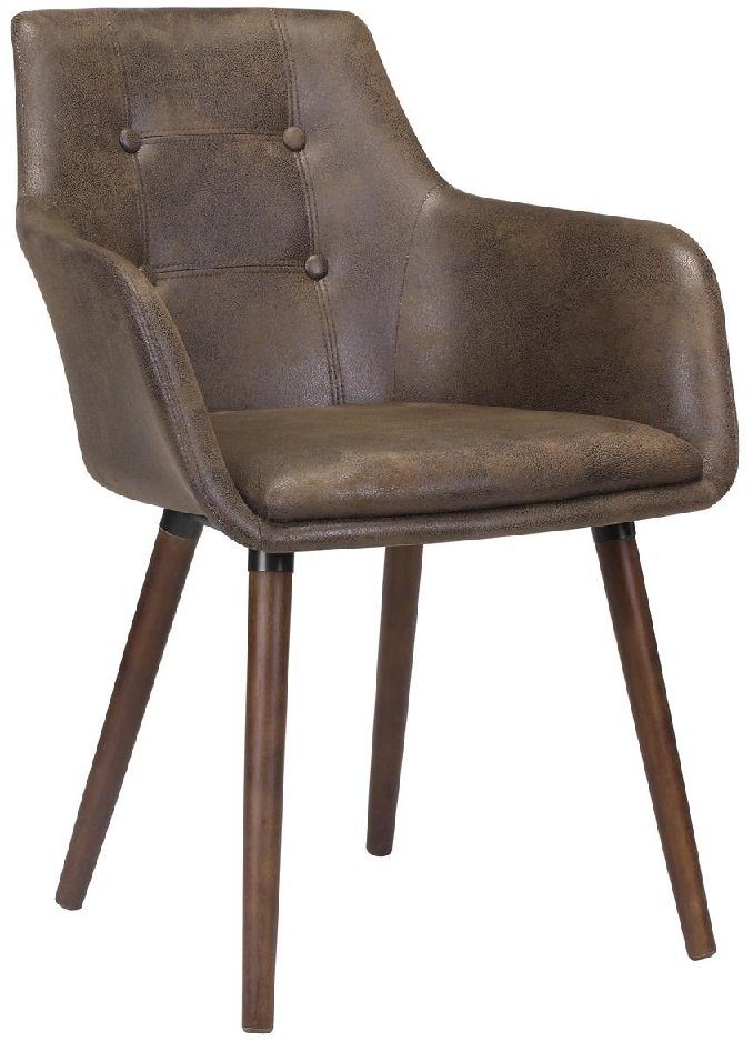 Elegant karmstol med en klassisk brun läderlook. Stolen är gjord av gummiträ som är lackat med en valnöts finish.