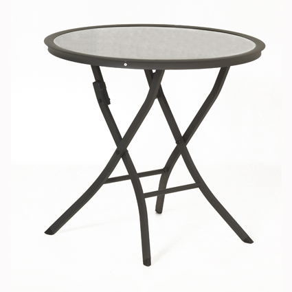 Messina runt bord är ett stilrent med en praktisk ihopfällbar lösning. Bordet är tillverkat i mörkgrå aluminium. Glasskiva av härdat glas. Se andra produkter i samma serie, Messina.