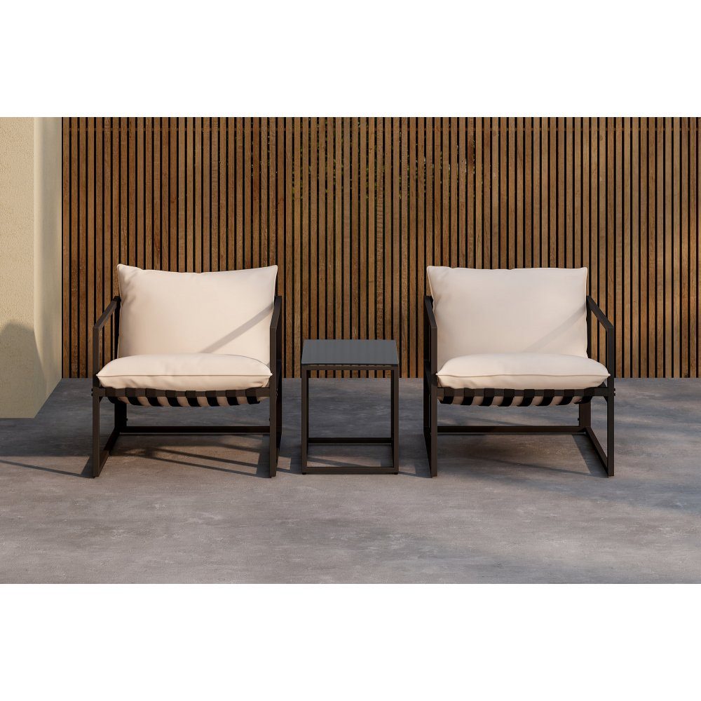 Loungegruppen Messina skapar en stilfull och inbjudande atmosfär på din uteplats. I en modern svart färg smälter gruppen in i olika utomhusmiljöer och ger ett elegant uttryck. Gruppen består av två bekväma fåtöljer och ett stilrent glasbord – en perfekt kombination för avkopplande stunder i solen. Fåtöljerna är tillverkade i robust stål och har mjuka dynor i slitstark polyester för hög komfort. Bordet har en hållbar glasskiva som vilar på en stålram, vilket ger en både snygg och praktisk yta. Placera Messina på verandan eller altanen och njut av stil och komfort under avslappnande stunder.