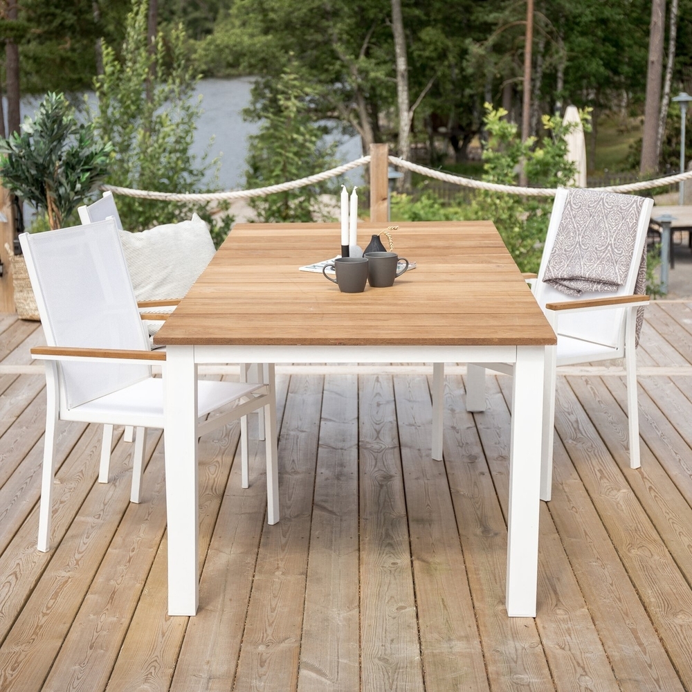 Mexico - ett rektangulärt matbord som gör succé likväl till vardags som till fest! Det här läckra matbordet har en modern bordsskiva i teak och ett underrede i vit metall. Den genomtänka helhetsdesignen är lika stilren som slitstark så här får du ett bord som kommer stå sig över tid! Följ våra skötselråd för bästa hållbarhet. Skötselråd: Våra teakmöbler produceras av certifierad teak som är odlad för ändamålet och inte skövlade från ömtålig regnskog. Som ett av de tåligaste träslagen innehåller teak mycket olja som sedvanligt behövs för att inte materialet ska spricka. Eftersom träslaget innehåller naturligt mycket behöver inte möblerna impregneras lika ofta.