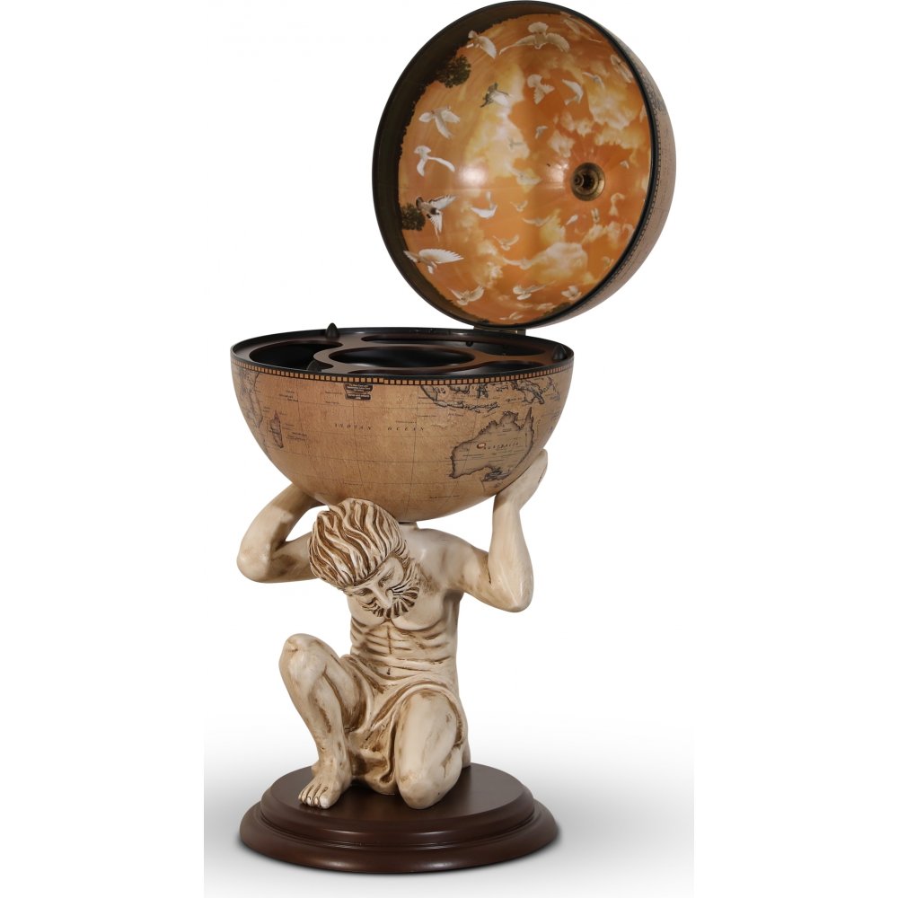 Barglob stående på vit staty, svarvad svart bottenplatta. Plats för flaskor och dylikt innuti bargloben.