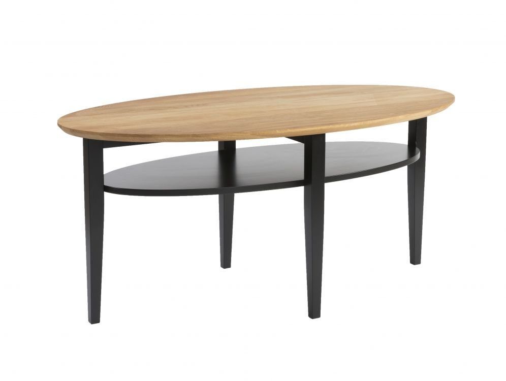 Härligt soffbord med en stilren design. Tillverkad helt i trä med en bordsskiva i naturlig träfärg och ben och underhylla i svartmålad trä. Den praktiska underhyllan är perfekt för förvaring. Bordet passar perfekt in i hushållet tillsammans med dem flesta soffgrupperna.