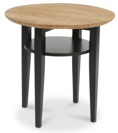 Härligt mindre soffbord med en stilren design. Tillverkad helt i trä med en bordsskiva i naturlig träfärg och ben och underhylla i svartmålad trä. Den praktiska underhyllan är perfekt för förvaring. Bordet passar perfekt in i hushållet tillsammans med dem flesta soffgrupperna. Bordet går även bra att använda som ett sidobord.