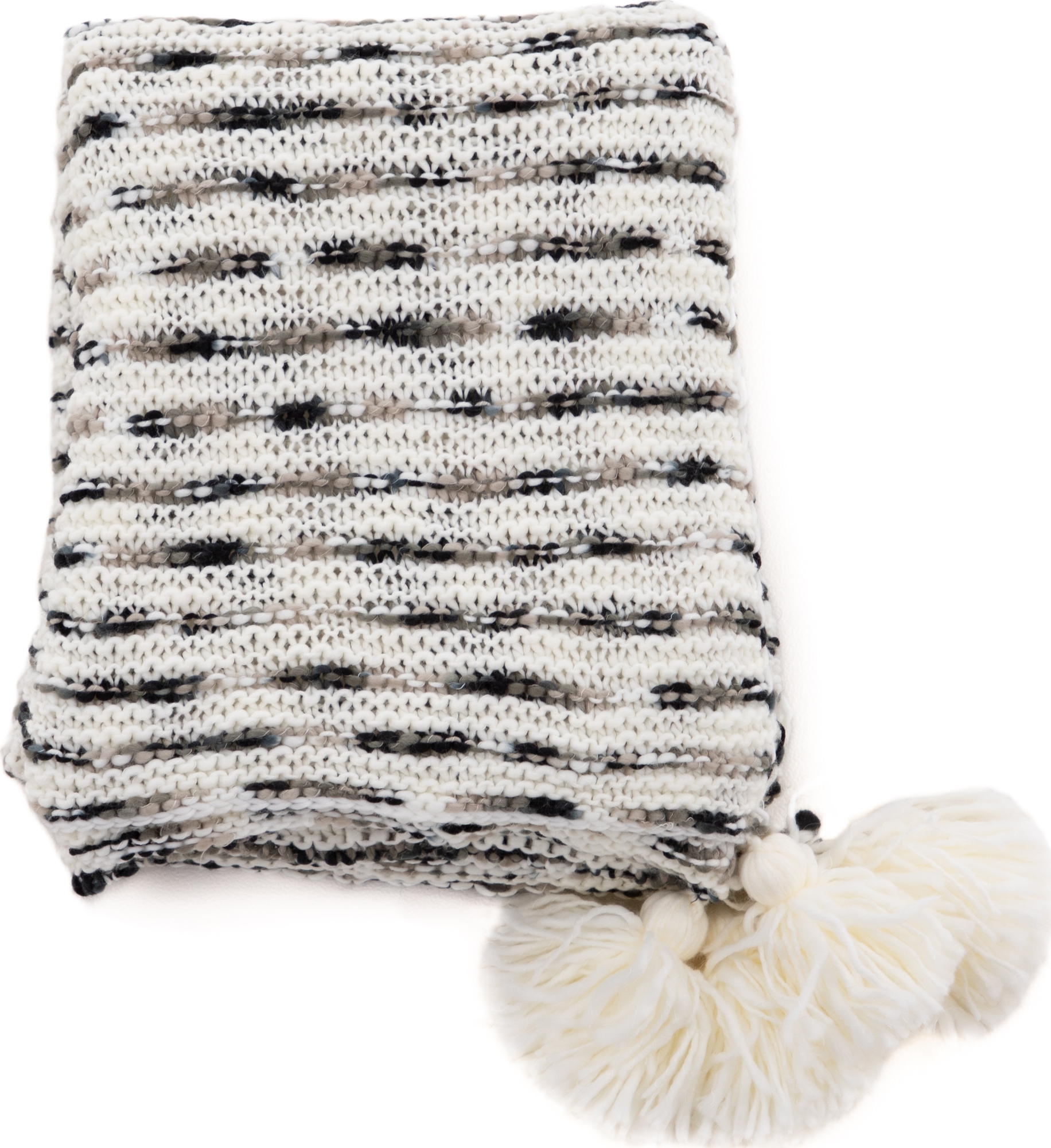 Mjuk pläd i vitt med inslag av jordnära grå nyanser. Pläden är tillverkad i akryl och har dekorativa toffsar.