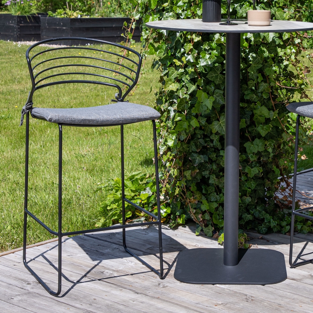 Barstolen från serien Milano gör ett imponerande intryck och kommer skapa ett modernt blickfång på din uteplats! Den skandinaviska designen är trendsäker med sina mjuka nordiska former och minimalistiska stuk. Sitsen är mjukt stoppad i grått polyestertyg och benstommen är stilrent smal i svart stål med ett lägre ryggstöd samt integrerat fotstöd för extra komfort. Lika bekväm som iögonfallande gör dessa barstolar sig utmärkt vid barbordet på altanen! Stolen är stapelbar.