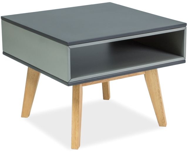 Ett snyggt sidobord med en modern design. Bordet är tillverkat av MDF och underredet är av solid trä. Bordet är rustat med en praktisk hylla under bordsskivan för smart förvaring av diverse prylar.