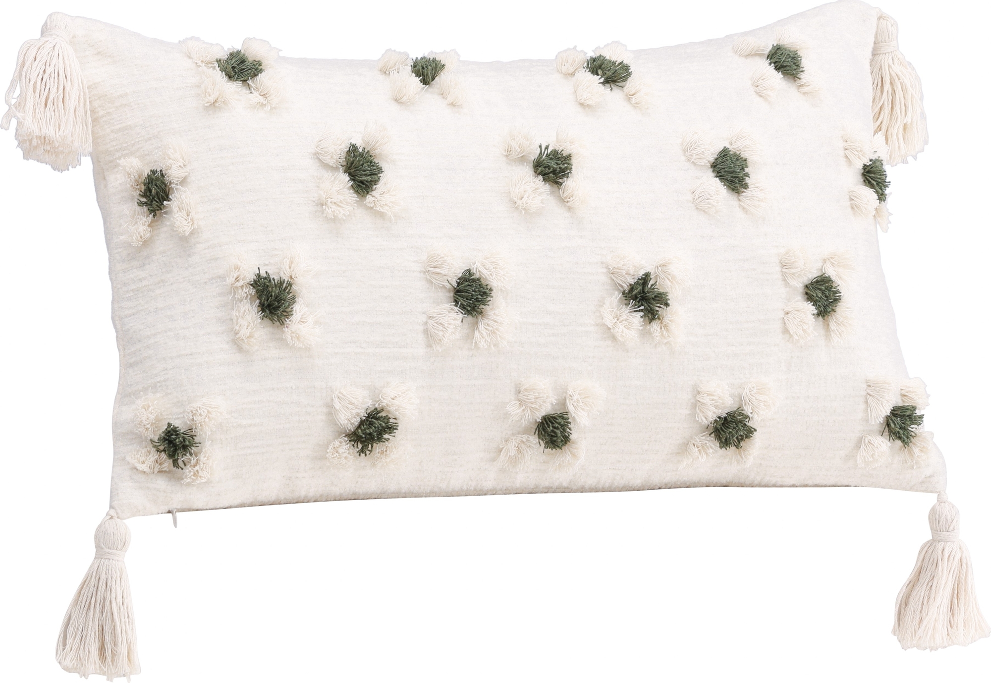 Pryd din soffa eller fåtölj med en snygg kudde i smickrande design. Det här avlånga kuddfodralet i beige baskulör har ett charmigt blommönster i tuftat grönt och beige tyg som ger läcker struktur till kudden. Med beige tofsar i vardera hörn får kudden ett nostalgiskt uttryck och det finns en dold dragkejda nertill. Tyget är polychenille vilket bidrar till en smakfull och slitstark textur.