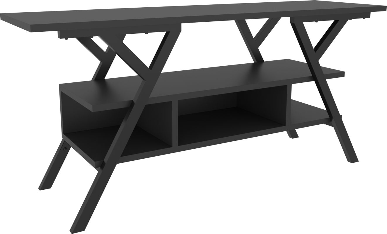 Mediabänk av metall med hyllplan av melaminbelagd spånskiva.