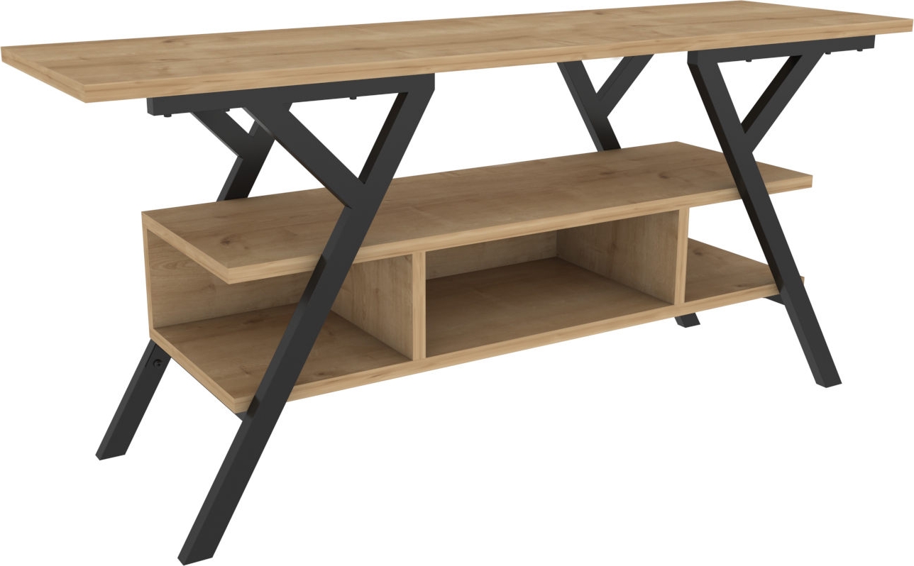 Mediabänk av metall med hyllplan av melaminbelagd spånskiva.