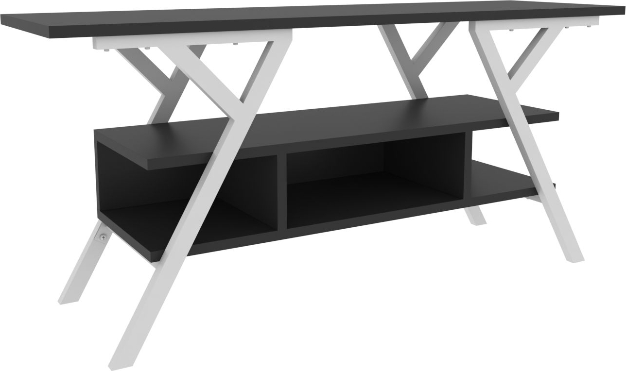 Mediabänk av metall med hyllplan av melaminbelagd spånskiva.