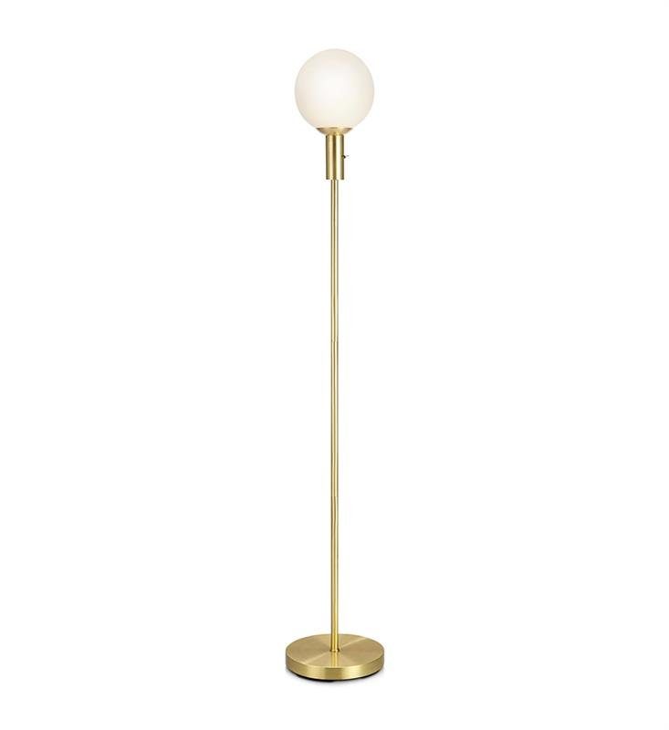 Minna golvlampa med en stilren design. Tillverkad i mässing och med en glasskärm. 2 meter sladd och inbyggd strömbrytare. Lampan är lättplacerad och passar perfekt in på flera olika platser i hushållet. Liten lamphållare (E14). Max 40W glödlampa eller motsvarande styrka i halogen, lågenergi eller LED.