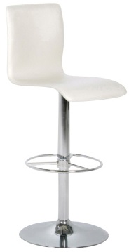 Bekväm barstol gjord av vit PVC med läderlook och kromad trumpetfot med fotstöd. TÜV märkt gasfjädring för höjdreglering av sitsen.
