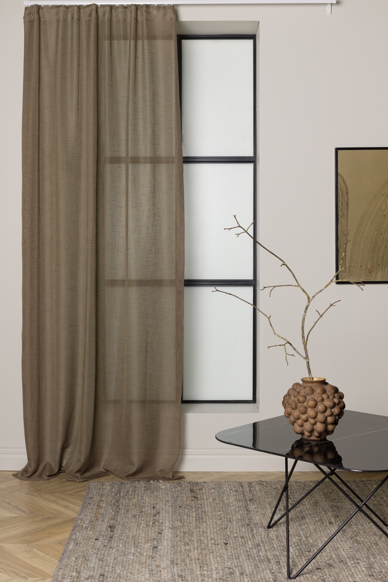 Gardiner i brun färg med ett skirt tyg av polyester. 1 eller 2-pack beroende på utförande (se nedan)