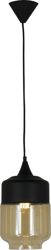 Taklampa i svart metall och amber färgat glas. Lätt upphängning i tak.