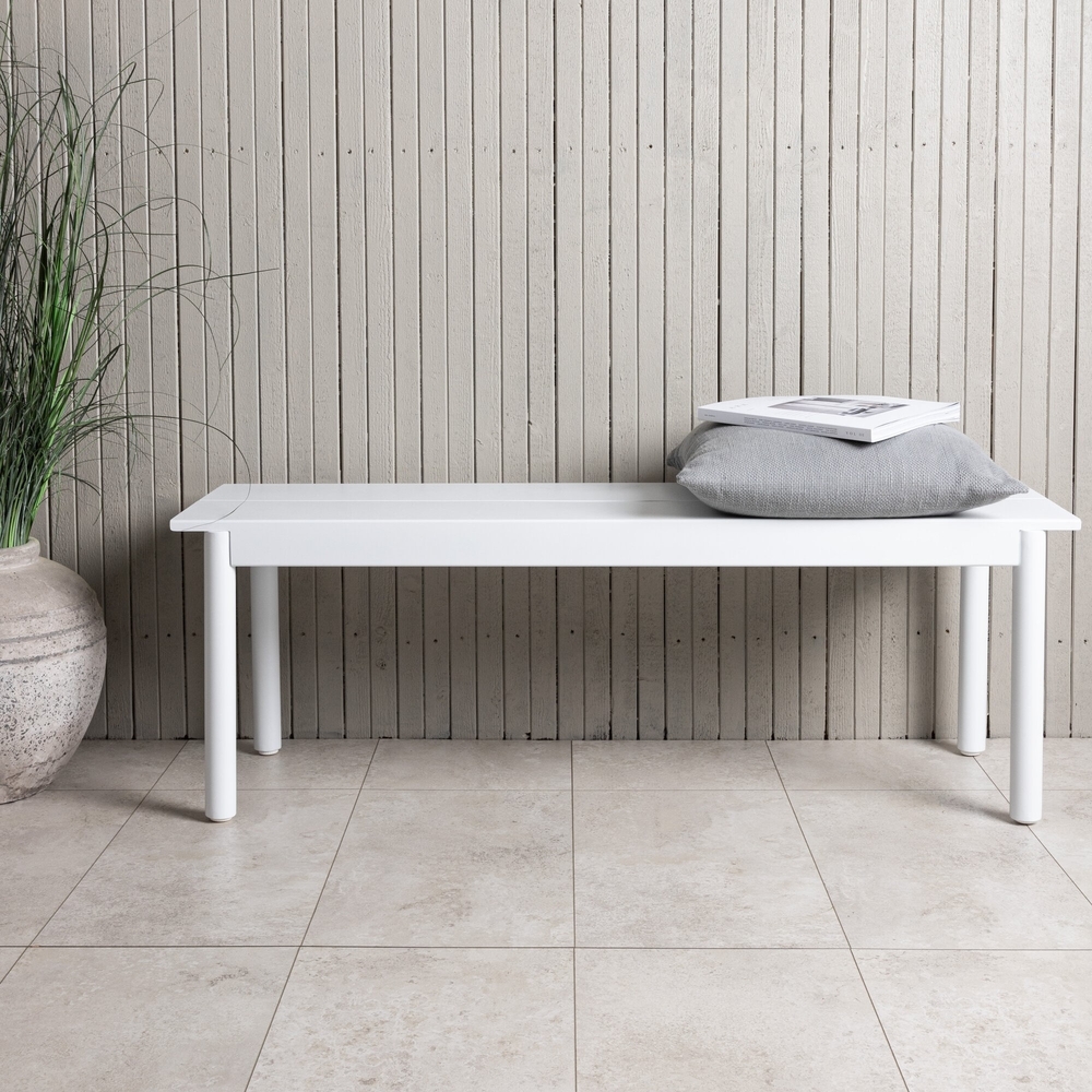 Samla enkelt vänner och familj kring bordet med Modena sittbänk! Modena är tillverkad i aluminium och förflyttas enkelt mellan olika ytor och passar såväl på den midre altanen som den stora uteplatsen.