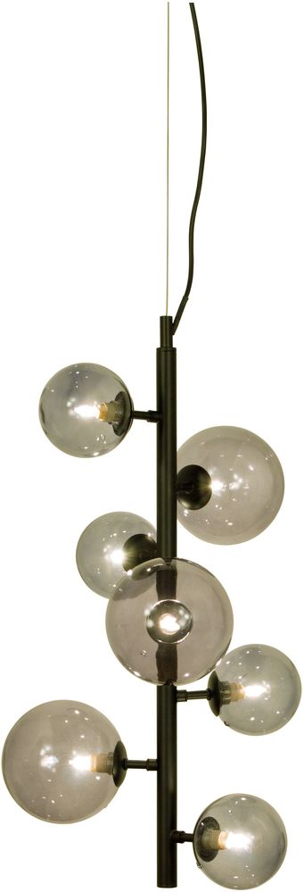 Taklampa i svart metall med 6 ljuskällor i rökgråa glaskupor. Hängs lätt upp i taket.