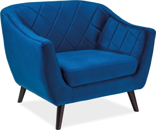Fåtölj av bokträ. Klädd med polyestertyg i sammetsimitation. Flamsäkert tyg.