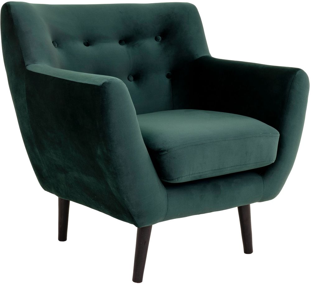 Fåtölj i mörkgrön velour och med svarta ben.