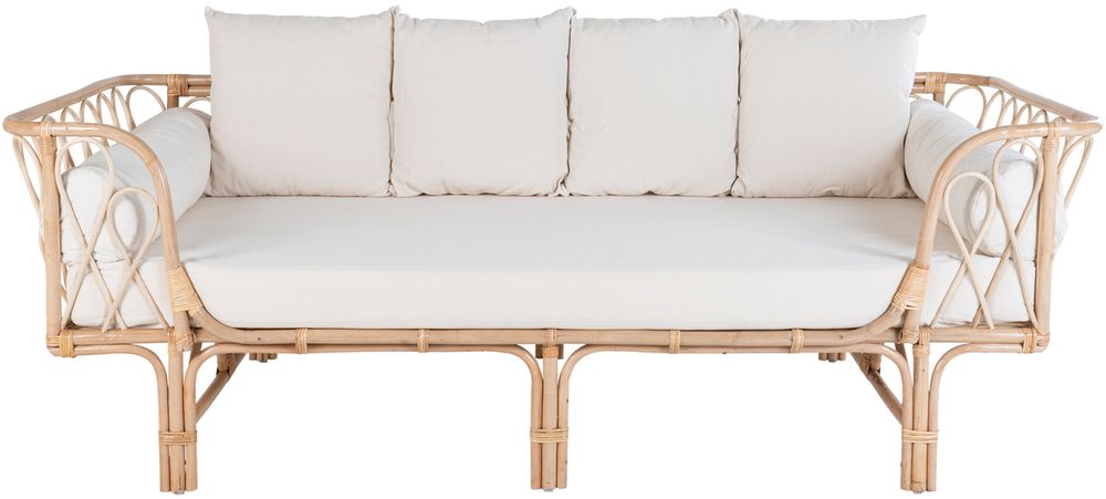 Rottingsoffa med dynor, ryggdynor och två kuddar.