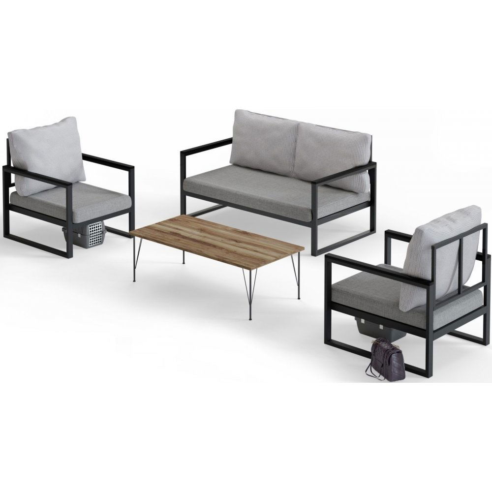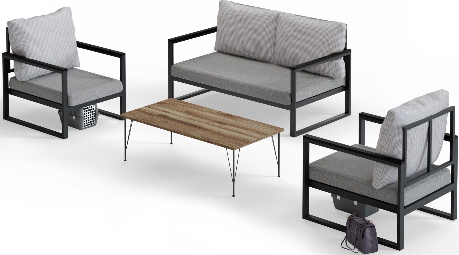 Loungegrupp av metall och polyuretanplast. Klädd med akryltyg.