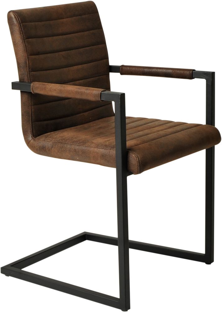 Karmstol med sits i brunt konstläder och ben och armstöd i svart metall. Armstöden har detaljer i konstläder som är både dekorativa och bekväma att vila armarna mot.