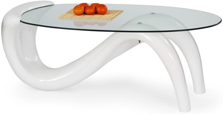 Ett konstnärligt soffbord med en modern design. Bordsskivan är tillverkad i klarglas och det häftiga underredet är tillverkat i glasfiber.