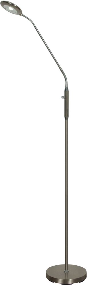 Golvlampa i metall med stål och krom utförande. Vridbart lamphuvud. Strömbrytare på stommen.