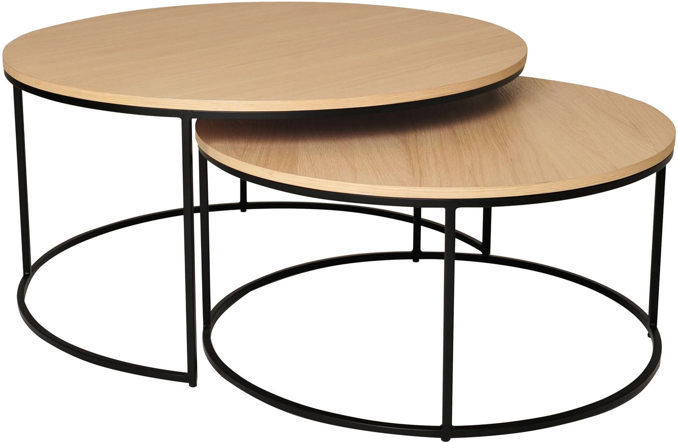 Set med 2 st soffbord i vitpigmenterad ek och svart metallunderrede. Det mindre bordet ryms under det större.