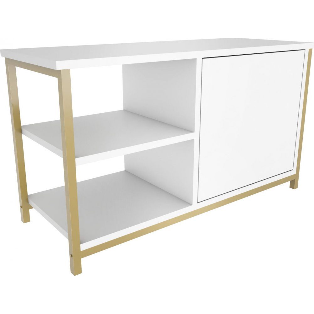 Mediabänk av metall med hyllplan av melaminbelagd spånskiva.