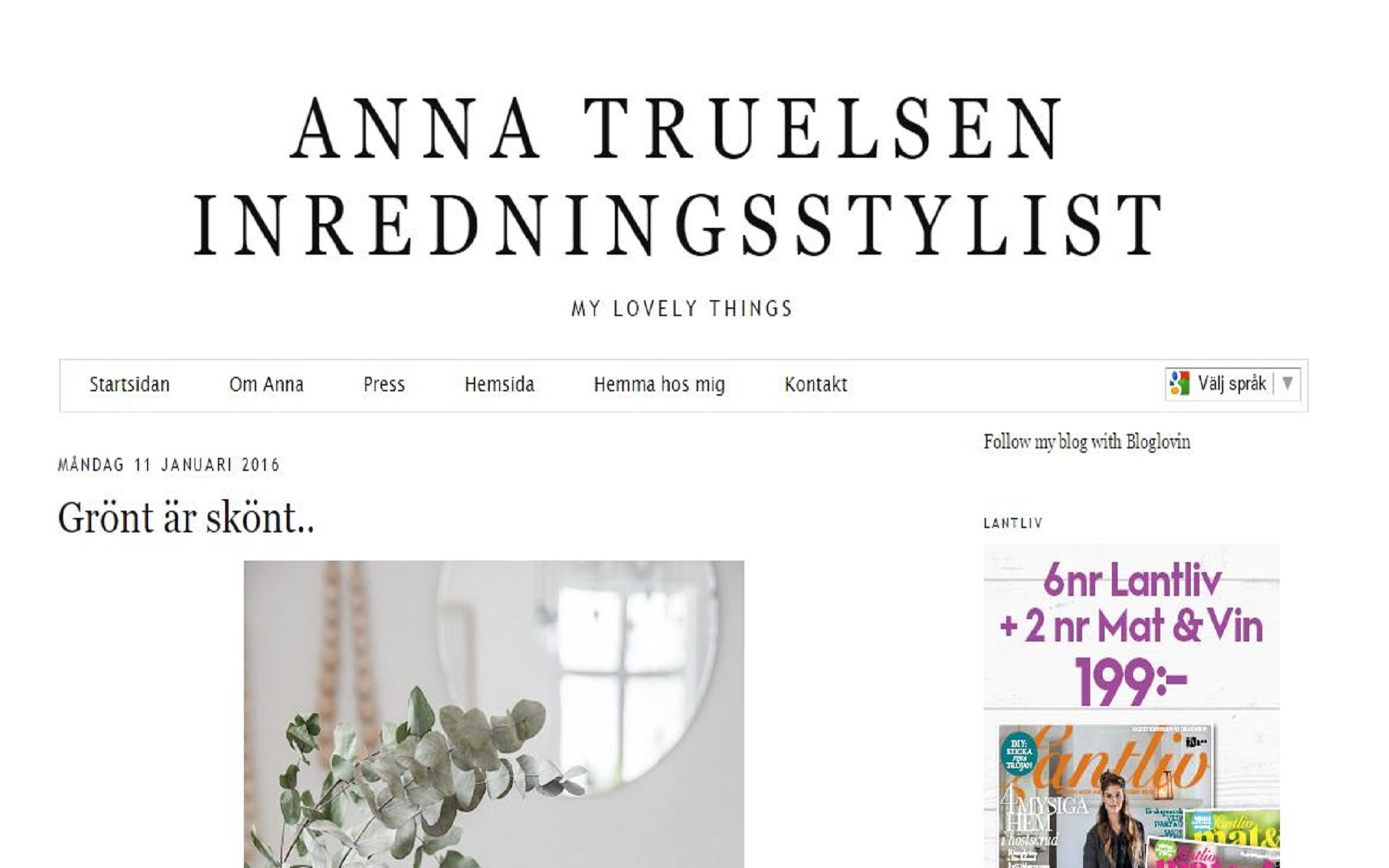 Anna Truelsson frilansande inredningsstylist driver bloggen MY LOVELY THINGS. Vi får följa hennes inredningsjobb och reportageresor som kan omfatta hem i Sverige, Norden men också andra platser som Provence. Men vi får också följa hennes hem och vardag. Anna älskar att skapa och arrangera det märks också på bilderna från hennes hem. Inredningen i det vita huset från ett av 1900-talets första decenium är vit och charmig, med många fina blickfång i form av samlade ting. Anna tillåter sig ett öppet kök med hyllor där vitt porslin och mycket keramik får sätta tonen. Just keramiken gör att köket andas lite lantlig och mjukare stil än många moderna hem. Den lite mjukare inredningsstilen följer med i resten av huset, avskalad men varm, vit med svarta möbler som kontrast.