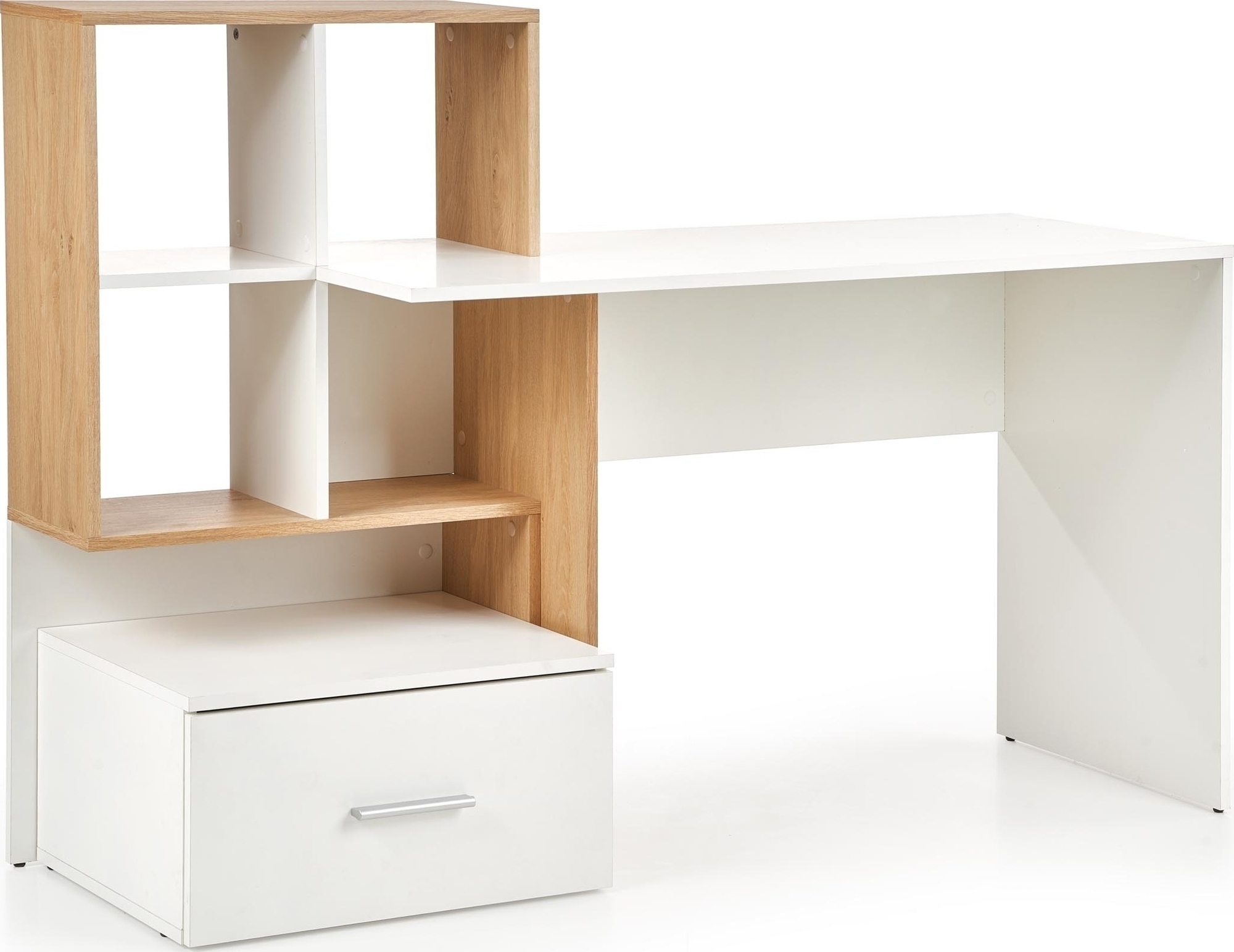Ett snyggt skrivbord med en stilren design. Skrivbordet är tillverkat av laminerad MFP (premium träskiva) och har en praktisk påbyggnad i form av en bokhylla för smart förvaring, samt en låda för ytterligare förvaring.
