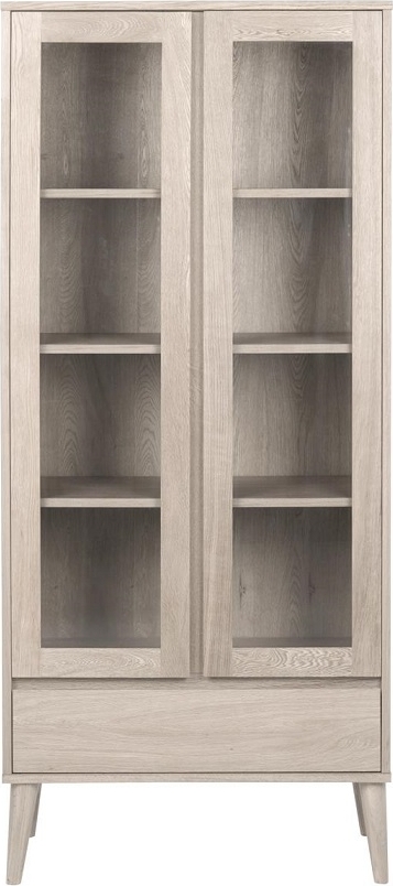 Modern vitrinskåp, gjort på vitpigmenterad och oljebehandlad fanerad ek med ben av massivt trä. Skåp med tre hyllor och glasdörrar och en låda för förvaring. Skåpet ingår i vår Nagano serie.