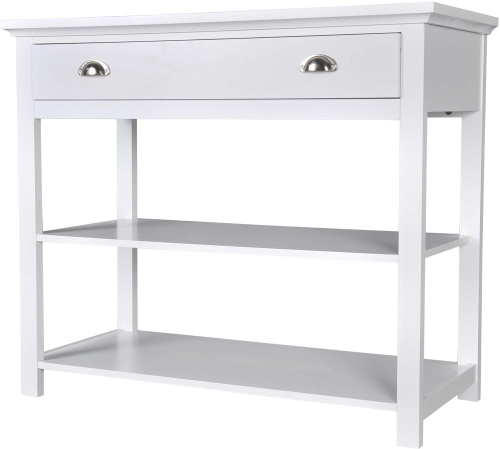 Stilrent konsolbord i vit MDF med två hyllplan samt en låda. Handtag i metall som på ett snyggt sätt bryter av det vita. Här kan småsaker förvaras eller varför inte använda den till att ha lite snygga prydnadssaker på.
