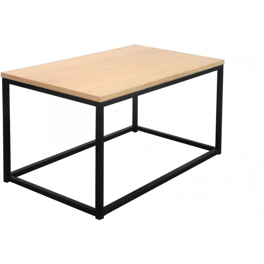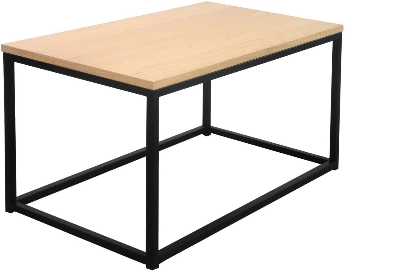 Soffbord med svart metallunderrede och toppskiva i vitpigmenterad ekfaner.