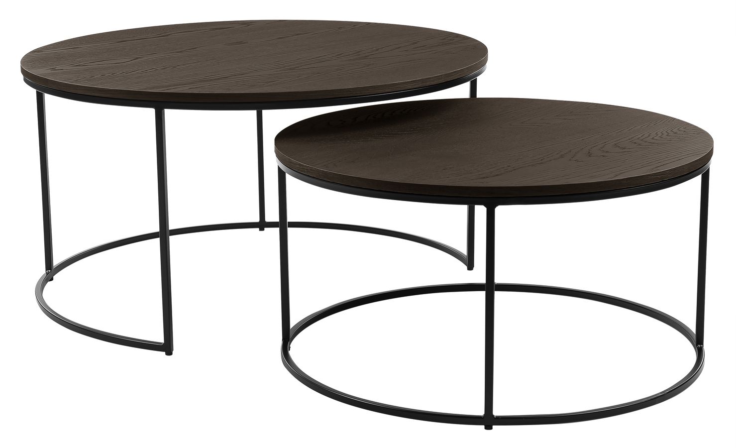 soffbord i set, 2 st runda bord med toppskiva av ekfaner och underrede av svart metall.