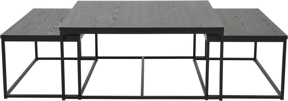 Set med 3 st soffbord med ram i svart pulverlackad metall och toppskivor i svart askfaner. De två mindre borden ryms under det stora.