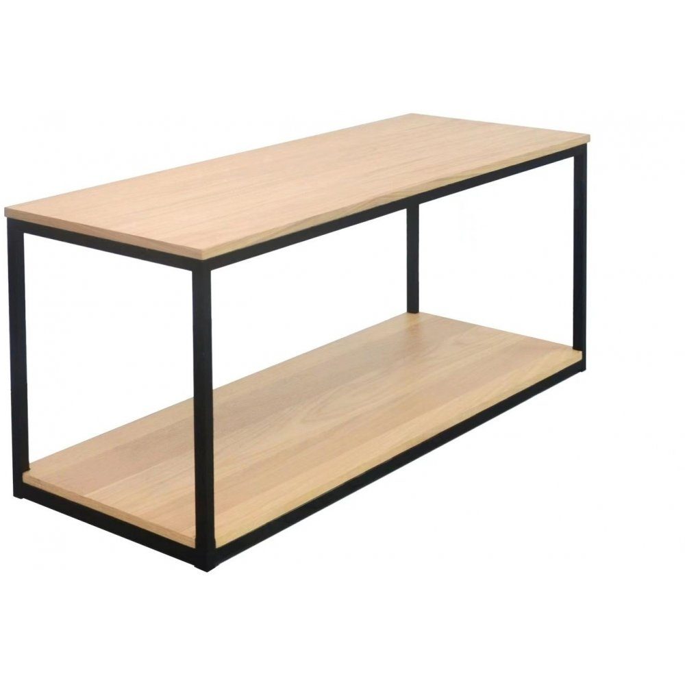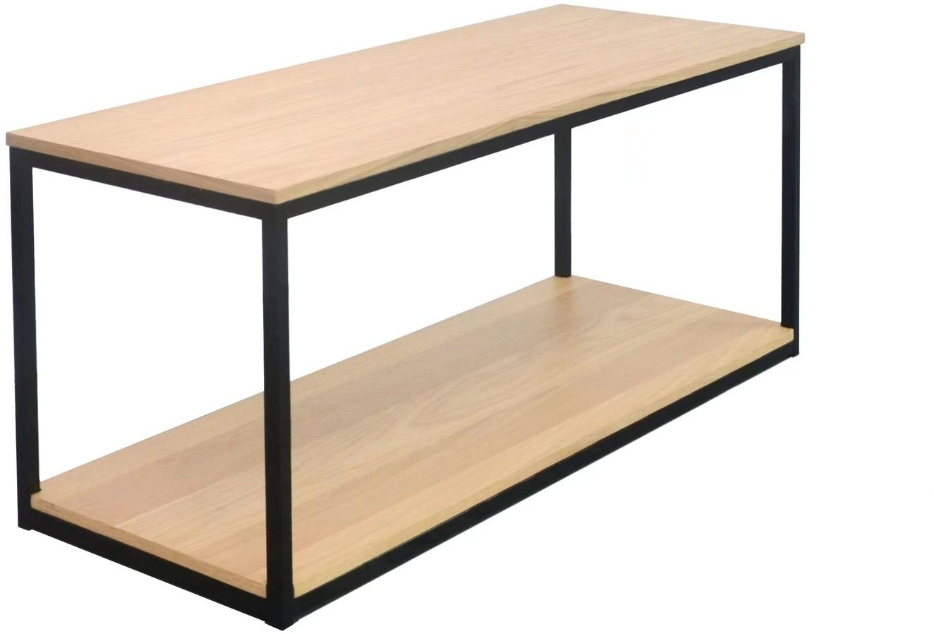TV-bänk i svart metallram och vitpigmenterade ekfaner hyllor.