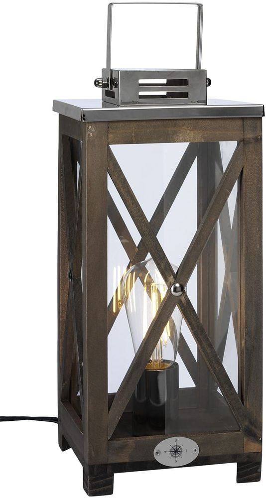 En snygg bordslampa med en klassisk design som efterliknar en lykta. Tillverkad i brunt trä med detaljer i metall och klarglas.