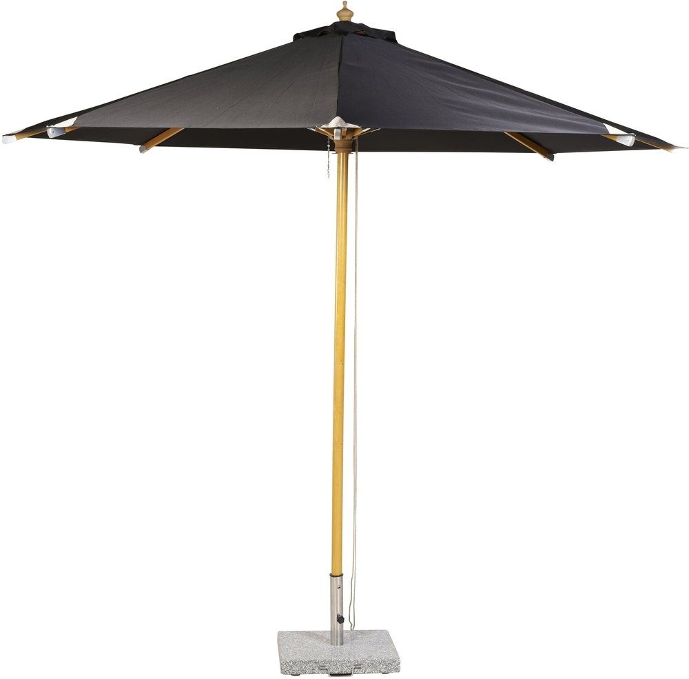 Naxos - ett smakfullt och fristående parasoll i något högre och bredare modell! Tyget är i tidlös svart kulör och stommen i stilfullt trä. Placera nära matgruppen och bestäm själv när du önskar skugga - passar utmärkt både som solskydd och blir en stilfull detalj vid utemöblerna. Skötselråd:Tyget är smuts- och vattenavvisande och går att rengöra genom försiktig handtvätt och dropptorkning. Möbelskum funkar också bra. Tyget är vattentåligt men inte vattentätt, taket tål 180g vatten och väggarna tål 160g.