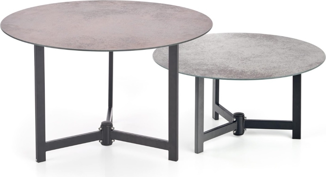 Två härliga satsbord med en stilren design. Bordsskivorna är tillverkade av glas med en snygg stenimitation och underredet är av pulverlackerad metall.