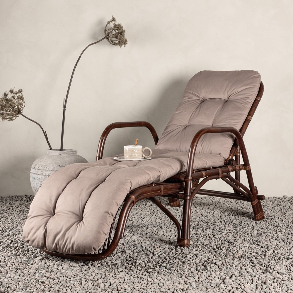 Upptäck en oas av avkoppling med solsängen Nella i vacker rotting. Den djupa mörk valnötfärgen ger en exklusiv touch till din utomhusmiljö, medan de mjuka beigefärgade dynorna skapar en ombonad känsla som inbjuder till total avslappning. Nella solsäng är inte bara en möbel, den är en inbjudan att slå dig ner och njuta av soliga dagar. Den robusta rottingkonstruktionen kombinerar stil med hållbarhet, och de beige dynorna ger en extra dimension av komfort och elegans. Skapa din egen personliga reträtt där du kan koppla av och låta solen värma dig i sommar. Luta dig tillbaka, slappna av och låt Nella solsäng bli din favoritplats för dagdrömmerier och solbad. Oavsett om du njuter av en lugn stund för dig själv eller bjuder in till en avkopplande stund med vänner, kommer Nella att bli kronan på verket i din utomhusupplevelse.