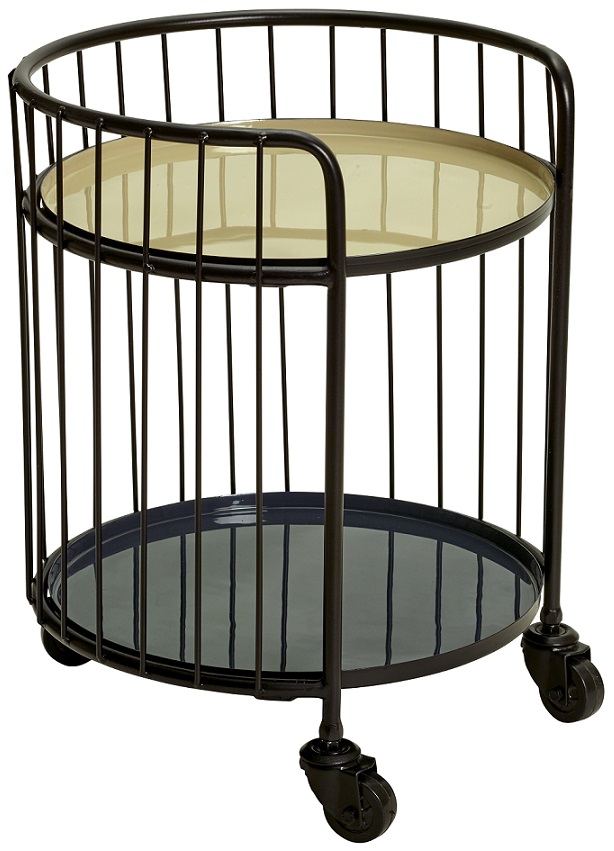 En traditionell serveringsvagn med en vintage design. Tillverkad i oxiderad metall. Underhyllan i blå emaljering medans överhyllan är i beige emaljering.. Denna serveringsvagnen är avsedd som dekoration och bör max belastas med en vikt på 30kg.