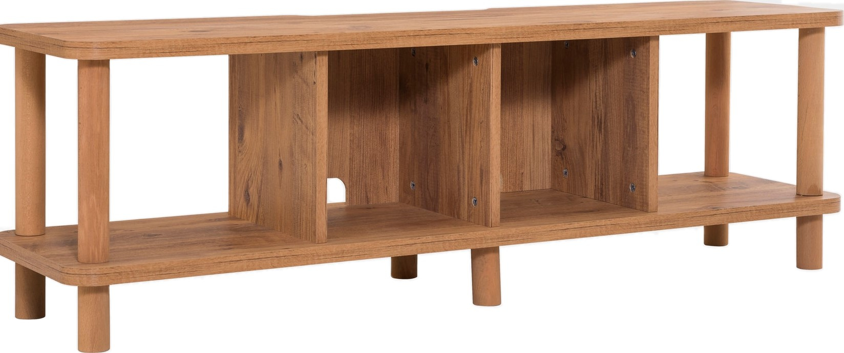 Mediabänk av melaminbelagd spånskiva och avenbok.