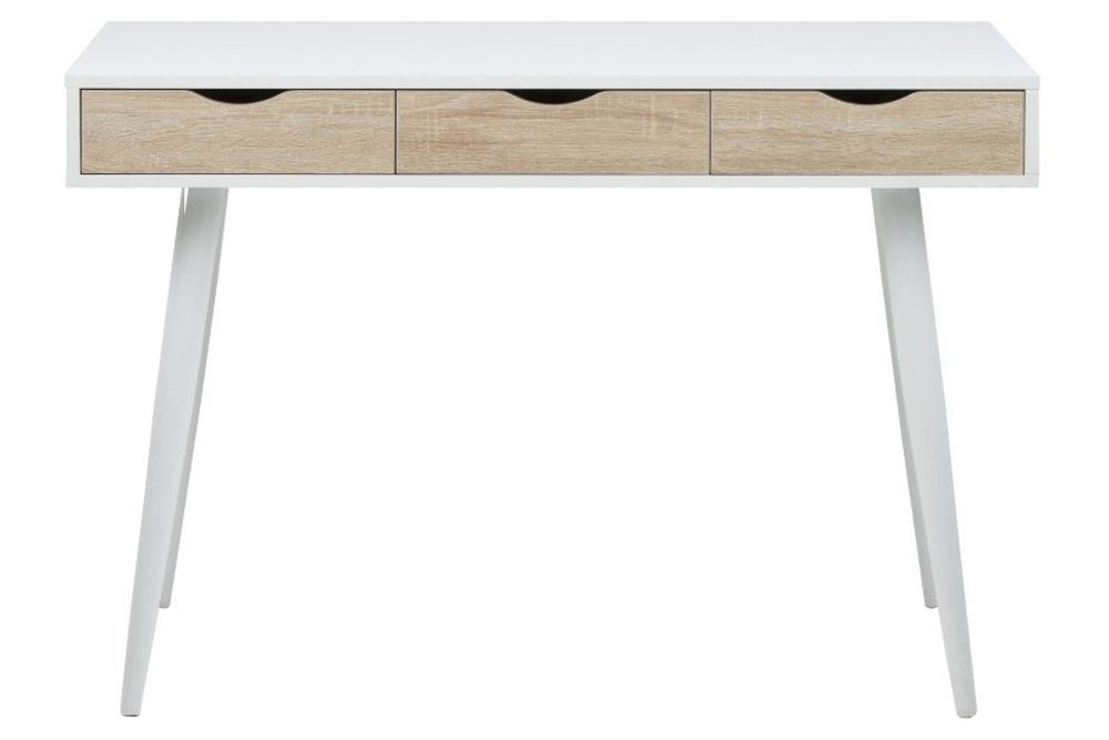 Modernt skrivbord med smart förvaring, tre lådor under bordsskivan. Själva bordsskivan och benen är vitmålade. Tillverkat av melamin, ekimitation på lådfronter.