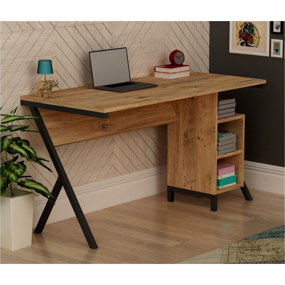 Skrivbord av trä med ben av metall och kantband av PVC.