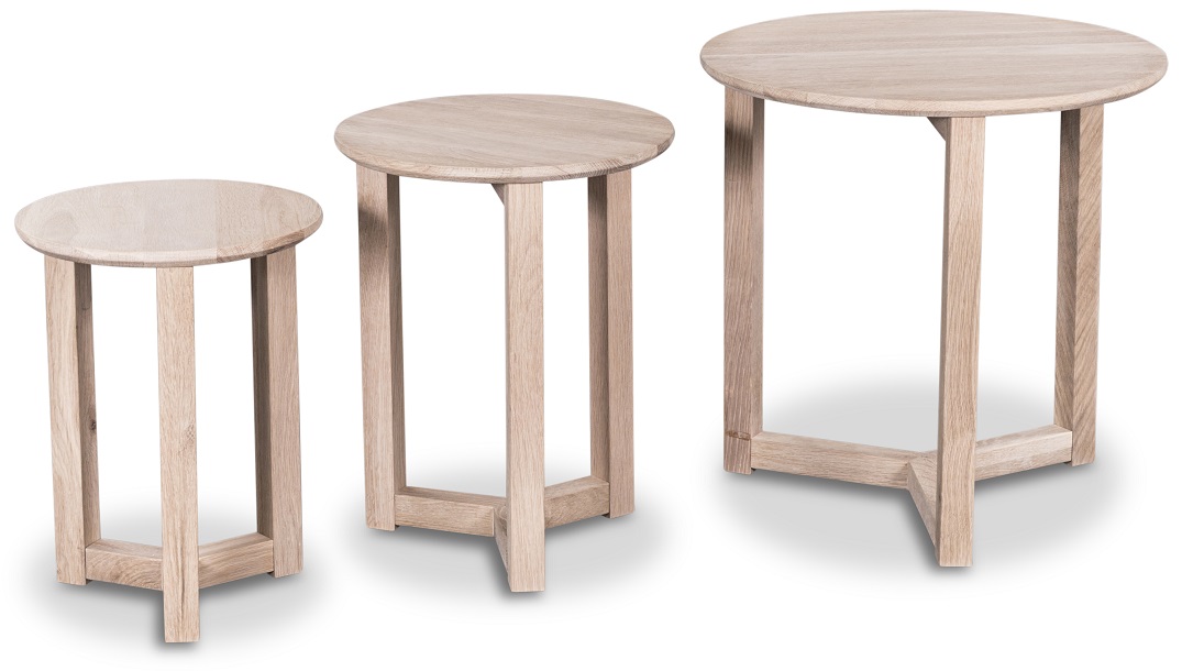 Ett satsbord med tre bord i olika storlekar som är lätta att placera och flytta. Bordet är tillverkade i massivt ljusoljad ek. Borden är användbara som satsbord, soffbord eller sidebord.