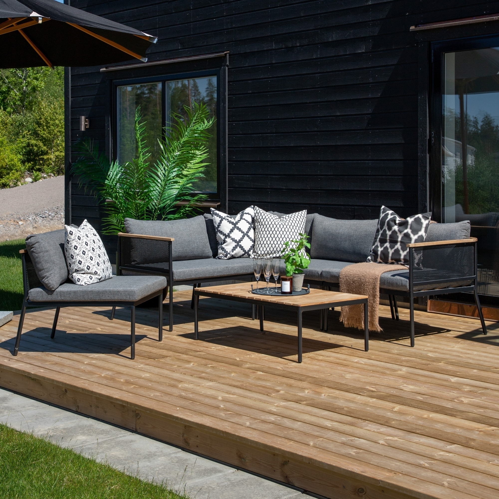 Soffgrupp i modern stilren design till din uteplats eller altan. Soffgruppen består av en hörnsoffa som är modulbaserad, så det går att placera den på flera olika sätt precis som du vill ha den med 3 sittplatser och en hörndel. Tillverkad i svart pulverlackerad metall och detaljer i svart metall nät och teak inklusive mjuka grå dynor samt ett rektangulärt soffbord med en bordsskiva i teak. Lättare montering krävs.